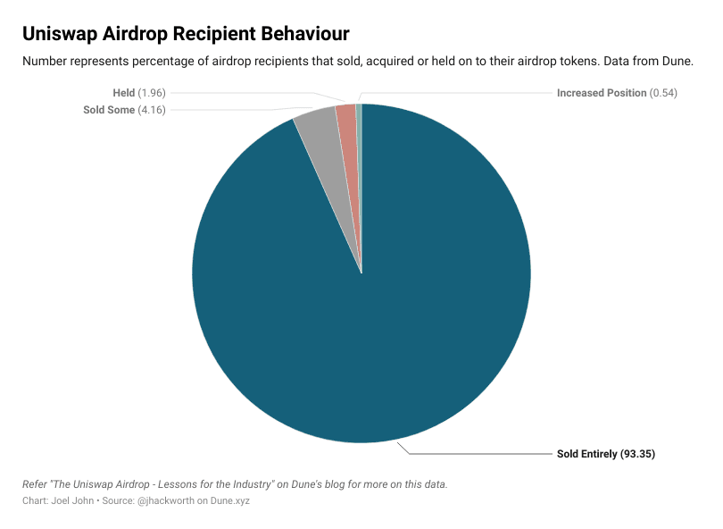 Airdrop Uniswap, cung cấp tối thiểu 400 token UNI cho bất kỳ ai giao dịch trên nền tảng, là một sự kiện mang tính thay đổi. Tuy nhiên, kết quả kinh tế bất ngờ và việc thanh lý token nhanh chóng của đa số người nhận đã đặt ra những câu hỏi về khả năng tồn tại và tính bền vững của các mô hình phân phối đó.