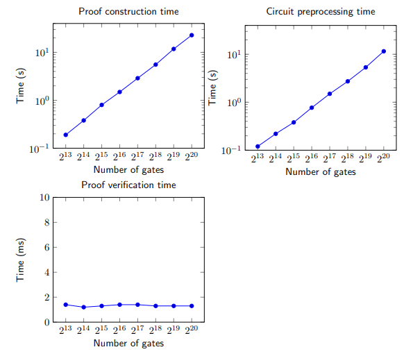 Benchmarking experiments demonstrate PLONK's remarkable performance. Proofs constructed for circuits containing over a million gates take under 23 seconds on consumer-grade hardware. Comparisons to FFT and elliptic curve scalar multiplications highlight PLONK's optimized execution of cryptographic operations, reinforcing its efficiency.