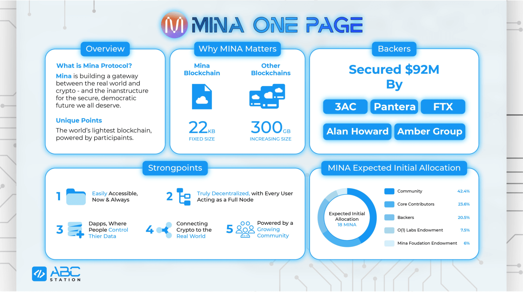 Mina Protocol định hướng trở thành một hệ thống thanh toán toàn cầu. Điểm đặc biệt của Mina là định vị chính nó là blockchain nhẹ nhất, duy trì kích thước không đổi chỉ 22 KB, bất kể khối lượng giao dịch. Giúp giải quyết trực tiếp các vấn đề về khả năng mở rộng gây khó khăn cho các blockchain thông thường.