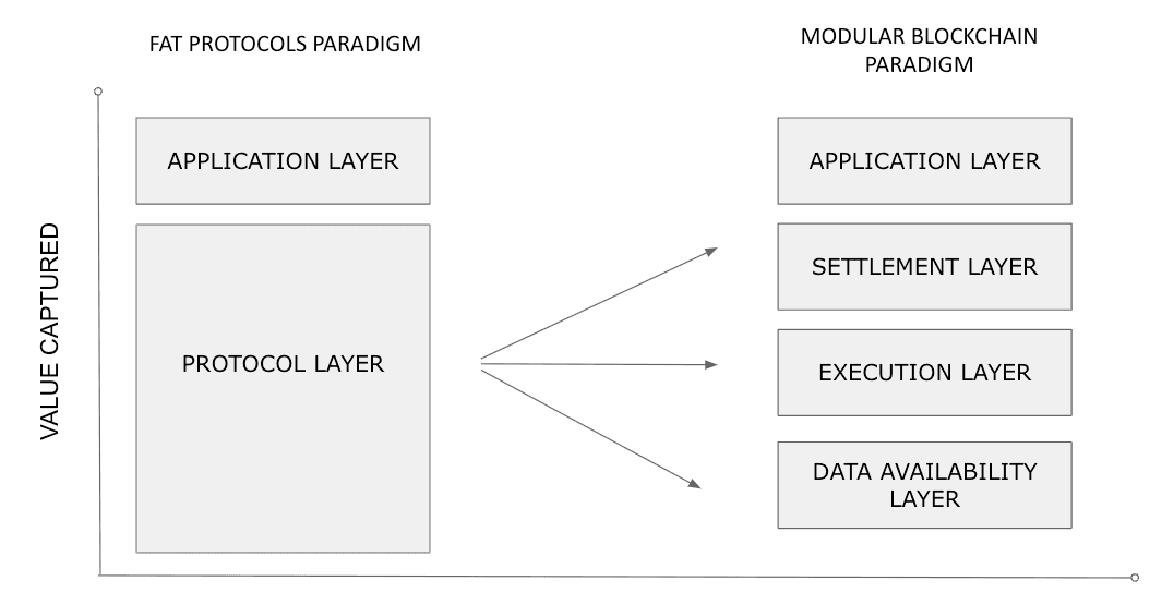 Kỷ nguyên của "Fat Protocol" có thể sắp kết thúc khi các blockchain mô-đun đạt được sức ảnh hưởng đúng với bản chất của nó. Các hệ sinh thái này cung cấp các lựa chọn thay thế hiệu quả hơn cho các chuỗi đơn khối.