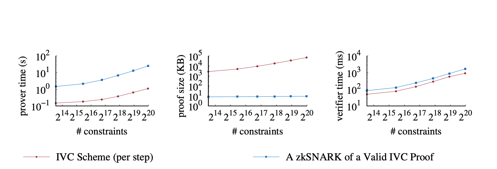 Furthermore, Nova's prover demonstrated impressive scalability, with the per-step cost of generating an IVC proof and compressing it scaling sub-linearly with the size of the computation. Compressed IVC proofs were notably compact, approximately 7,400 times shorter than their uncompressed counterparts. Verifying a compressed proof incurred only a modest increase in computational costs compared to verifying a considerably longer IVC proof.